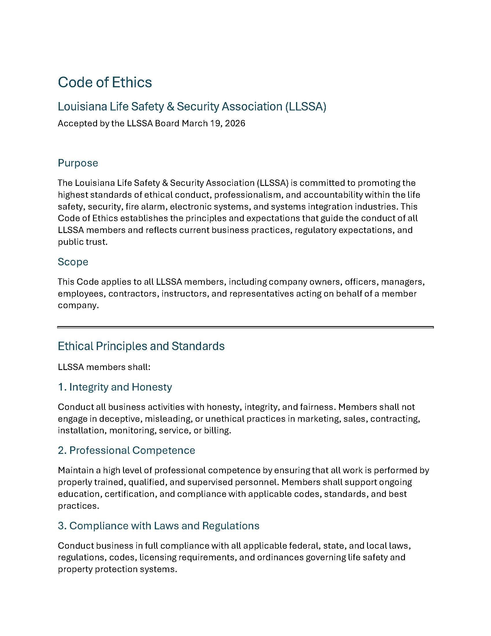 As members of the Louisiana Life Safety and Security Association we shall strive to maintain the highest level of integrity and professionalism within the electronic life safety, security, and systems integration industry by adhering to this Code of Ethics.