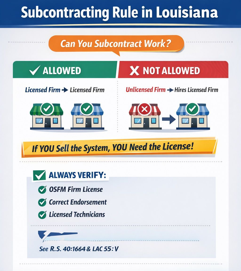 In short: subcontracting is allowed in Louisiana’s life safety and property protection industry, but only when the companies involved are properly licensed for the specific type of work being performed. A company cannot bypass licensing requirements by subcontracting regulated work to another firm.